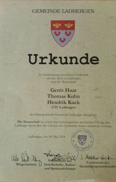 Nach der Teilnahme bei den Westdeutschen Pokalmeisterschaften 2016 konnten die 3 Spitzenspieler des TTC Ladbergen ein Jahr später noch eins drauflegen und qualifizierten sich für die Deutschen Pokalmeisterschaften in Fröndenberg im Sauerland. Dies war die erste Teilnahme einer Mannschaft des TTC Ladbergen 1961 in seiner über 50jährigen Vereinsgeschichte auf Bundesebene.